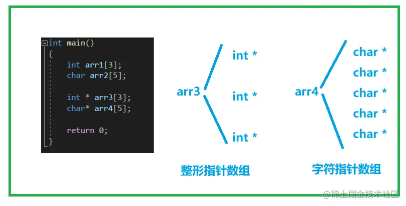 那指针数组是怎样的?我们知道变量和指针都有不同类型,而同一种大小类型的变量和指针之间差一个 * 号,所以指针数组也和数组相似: