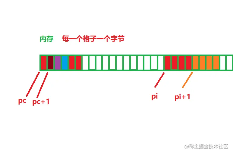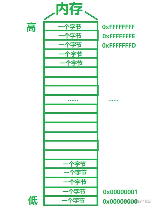 这里是编译器里面的一个存储数据的内存,然后我们把他分为若干个字节,每一个字节叫做一个内存单元。每一个字节进行一个编号,这个编号是唯一跟这个单元匹配的,用这个编号就可以找到这个内存单元。