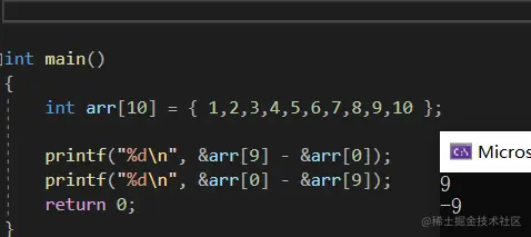 这里我们创建一个数组,然后地址-地址,也就是指针-指针,得到的是什么呢?我们来看一下结果: