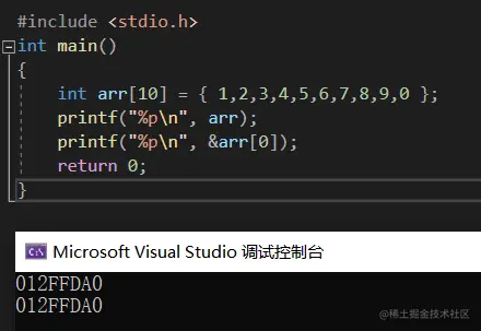 我们来观察一下,数组名和数组首元素地址有什么联系,结果: