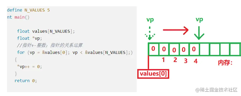 这里就是拿指针变量vp和数组比较,然后按照大到小依次把数组里面的值变为0,指针的比较就是指针的关系运算。