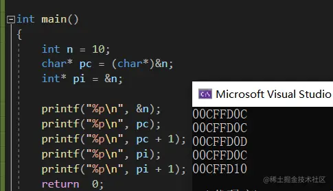 我们可以观察到,n的地址是00CFFD0C(当然每一次运行的时候都有可能不一样),然后我们创建的char * pc指针变量存储n的地址,这里因为类型不同在&n前面加了强制类型转换,而int * pi同样也是存储n的地址。然后我们发现,pc跟pi存的地址打印出来的时候都是一样的,说明存储这个过程是可以进行的,但当pc和pi加1后,就产生了差异。