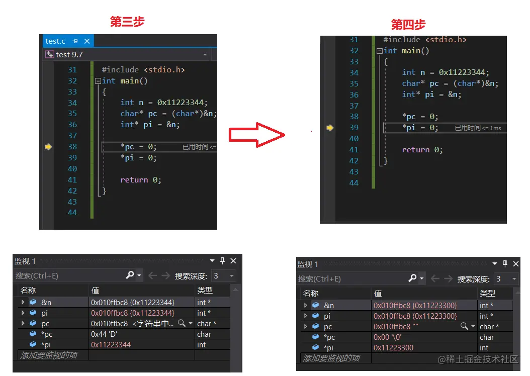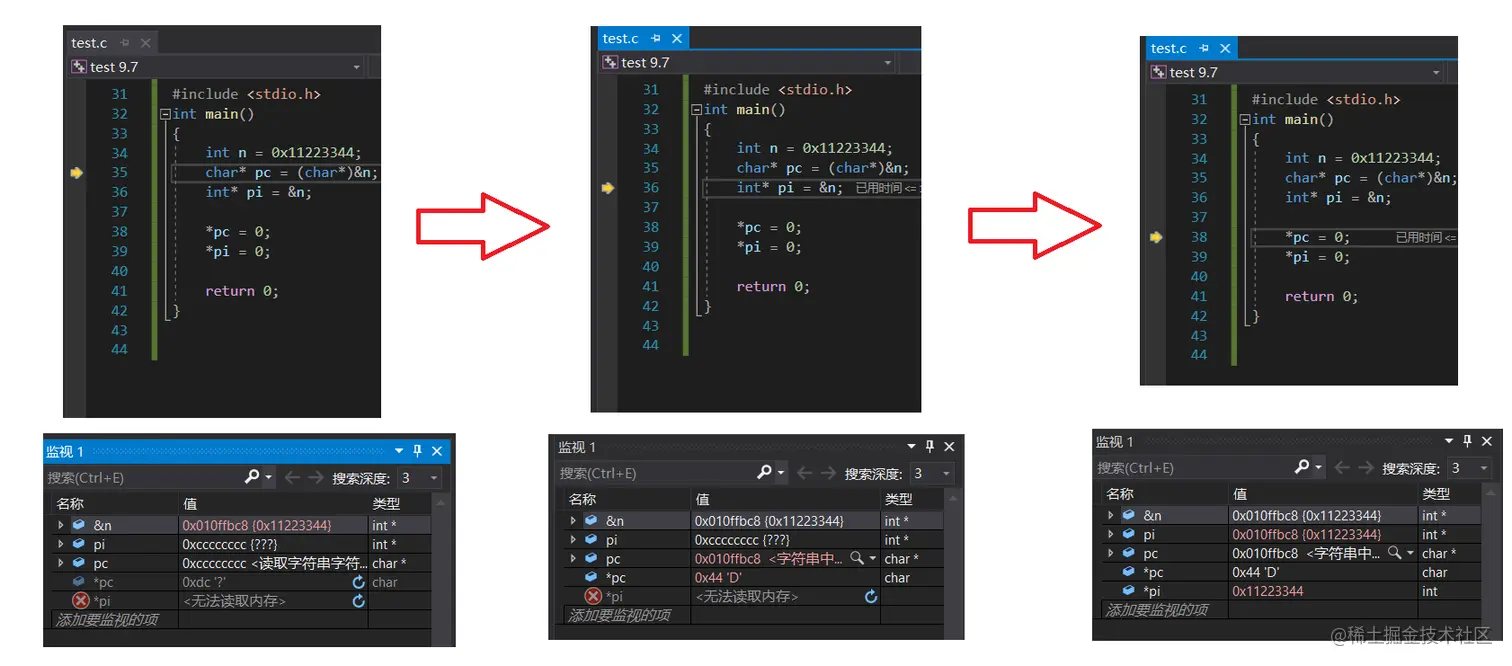 ① 这里的第一步就是创建n变量,第二步创建char * pc存储n的地址,第三步创建int * pi 存储n的地址。这些都不重要,下面两条代码才是主要的区别,看他们值的变化。