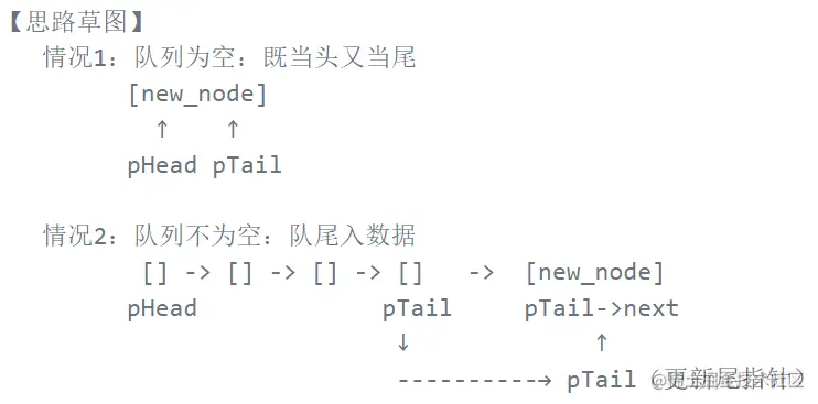 ③ 新节点创建好后,我们可以开始写入队的操作了。首先要理解队列的性质:队尾入数据,队头出数据。这里既然是入队,就要在对尾后面进行插入。这里我们还要考虑到如果队列为空的情况,这时我们要把头指针和尾指针都交付给 new_node 。为了理清思路,我们可以画一个思路草图来帮助我们更好地理解: