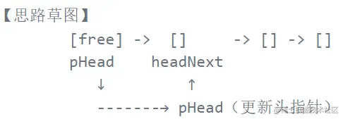 出数据需要释放,和销毁一样,这里使用一个类似于信标性质的指针来记录 pHead 的下一个节点,之后我们就可以大胆地释放 pHead 而不用担心找不到了。free 掉之后更新头即可,令头指针指向 headNext 即可。