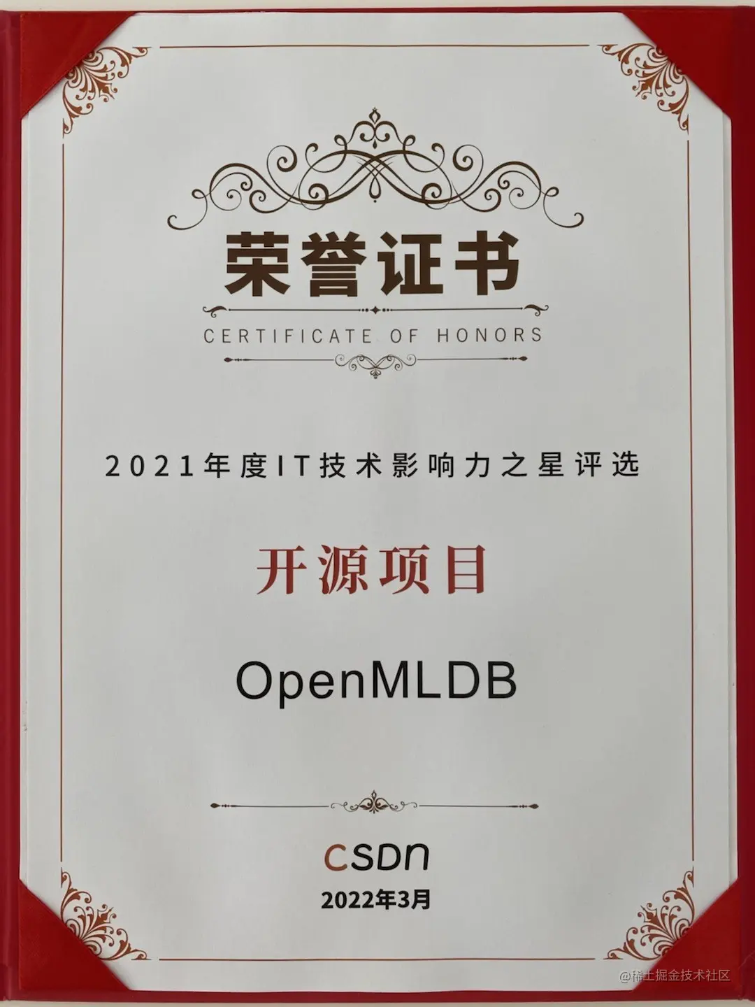 3 月 30 日,CSDN 2021 年度 IT 技术影响力之星颁奖典礼成功举行,并揭晓了个人、公司和创新技术及产品等三大类共 12 个奖项的评选结果。在颁奖典礼上,OpenMLDB作为国内首个开源机器学习数据库,凭借持续进步的技术创新、不断扩展的功能覆盖斩获“年度开源项目”奖项。