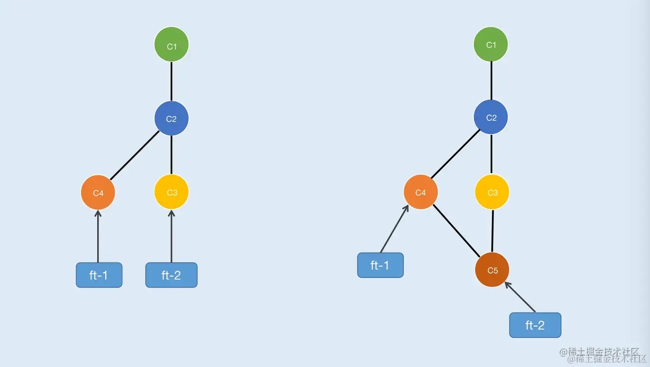 这种情况就不能直接合了,当ft-2执行了“git merge ft-1”后Git会将节点C3、C4合并随后生成一个新节点C5,最后将ft-2指向C5 如图3-2(右)