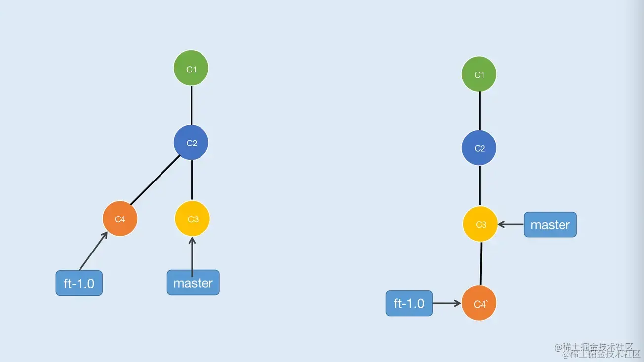 当左边示意图的ft-1.0执行了git rebase master后会将C4节点复制一份到C3后面,也就是C4',C4与C4'相对应,但是哈希值却不一样。