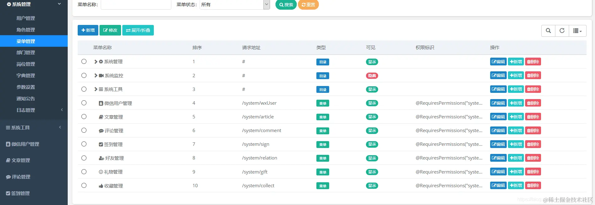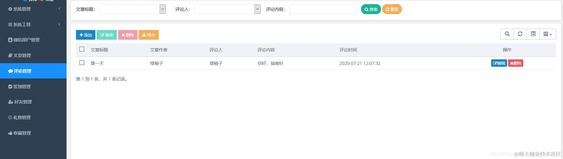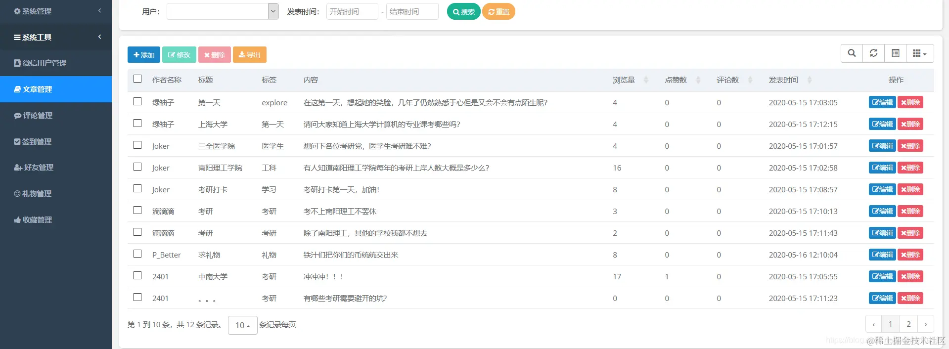 功能主要包含文章管理、评论管理、签到管理、好友管理等功能