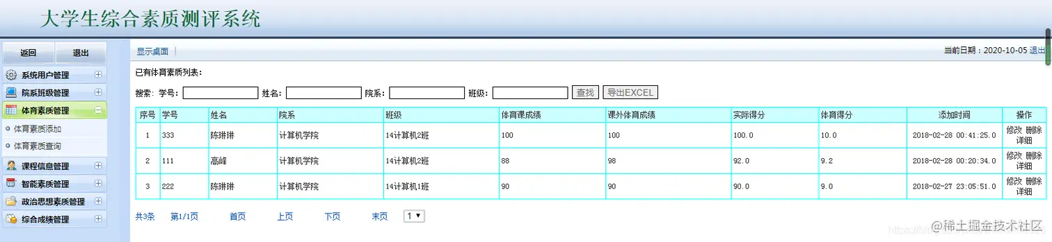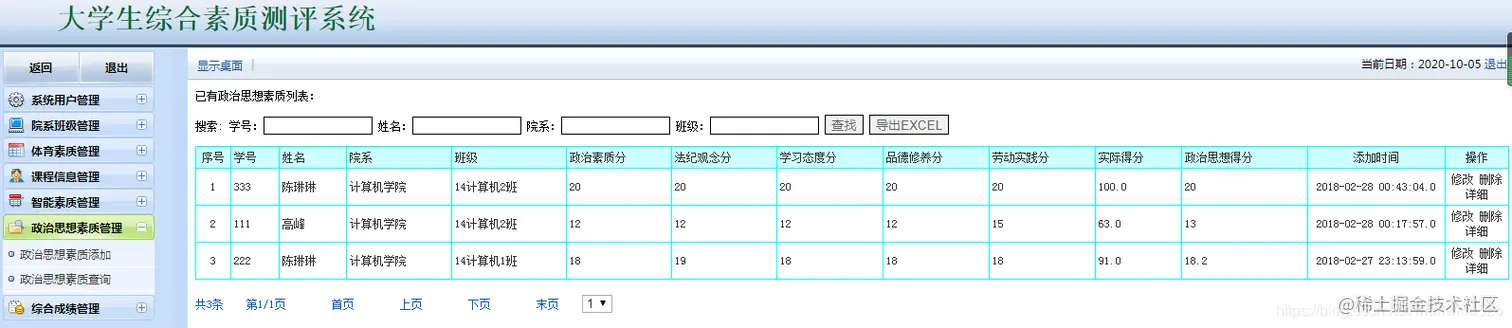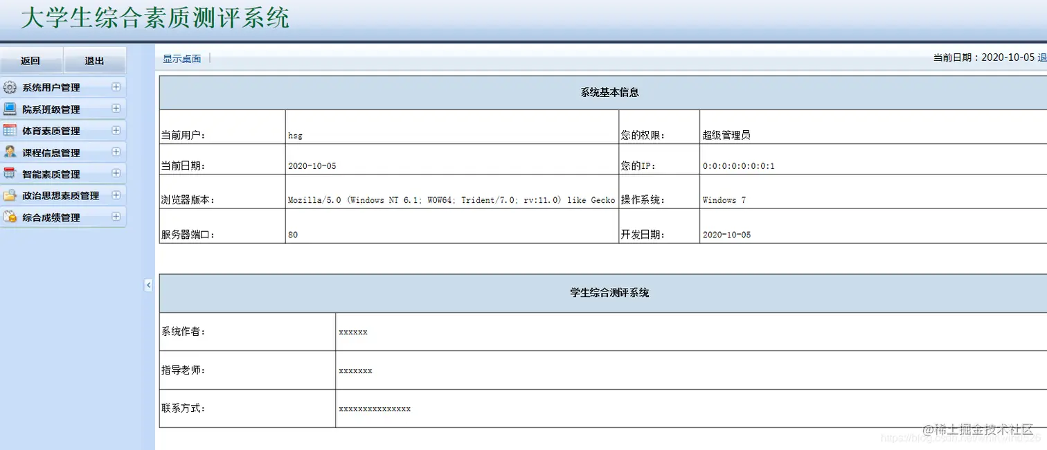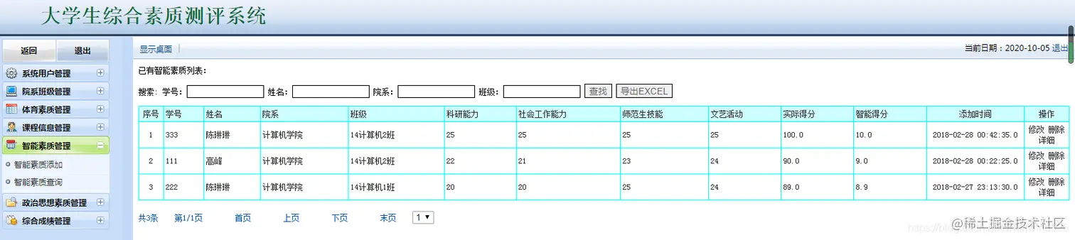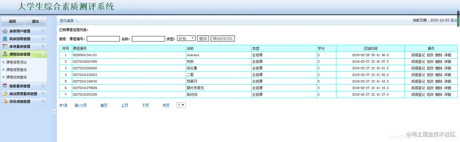 大学生综合素质测评系统:包含用户管理,学生管理,院系管理,课程管理,各种测评成 管理等,数据可以导出EXECL,分用管理员用户和学生用户,管理员管理信息,用户查看自己的成绩信息。