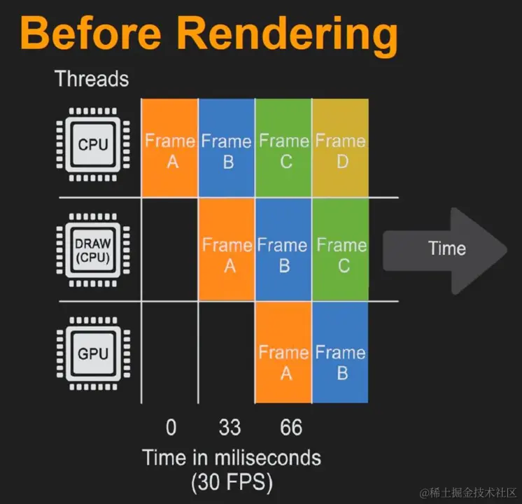 为了将第一张画面(FrameA)呈现在我们面前,首先就是Cpu在0毫秒的时候处理FrameA,然后紧接着在第33毫秒Draw线程再对经过Cpu线程处理后的FrameA进行再处理(遮挡剔除,后面会讲),这时候Cpu线程在33毫秒处开始处理FrameB。之后在第66毫秒Gpu线程开始实际渲染FrameA。与此同时,Draw线程已经开始处理FrameB了,同时Cpu线程则已经开始处理FrameC。依此类推。。。