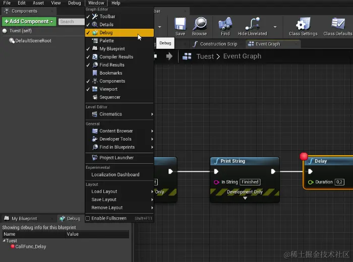 可视化编程的断点调试非常简单,断点就是基于节点的,选中节点,F9切换节点,或者通过右键菜单。而且还有一个debug窗口可以方便地查看当前变量。\