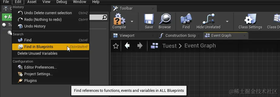 Ctrl+F是当前蓝图中搜索,Ctrl+Shift+F则是在所有蓝图中搜索,和visual studio等编译器一样。\
