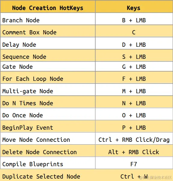 和材质编辑器一样,蓝图中也可以通过快捷键生成各种常用的节点,对于初学者来说,这张表代表重要的,需要优先学习的节点。\