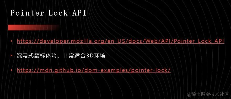 沉浸式鼠标API是一个黑科技,当指定一个dom元素进入PointerLock之后,鼠标隐藏掉,同时鼠标的运动感知不到元素的边界,即在任意方向上可以无线运动,这种使用体验很符合3D人物的操作习惯。