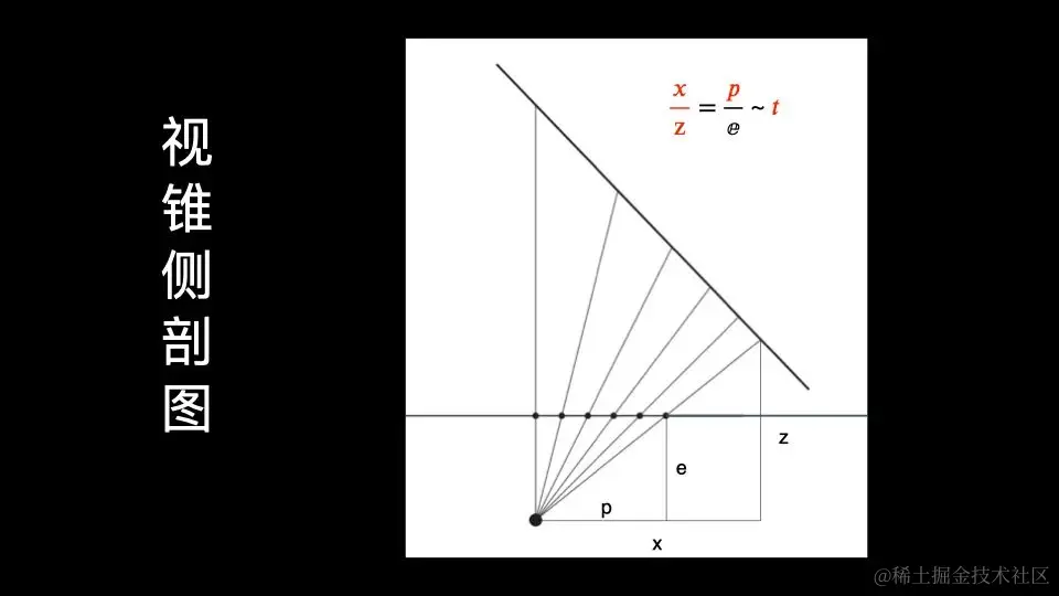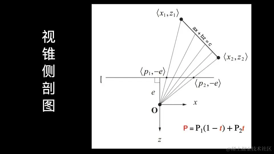 所以怎么办呢,不能简单的线性插值,所以我们要找到插值和插值点之间真正的函数关系,所以我引入了下面的视锥侧剖图:其中O点是摄像机,L是近截面,ax+bz=c是三角形。我们抽象一个虚拟的插值点t,范围是0~1,t从(P1,-e)出发,匀速运动至(p2,-e),t的值也匀速地从0增长至1。图中可以看出,近截面上的均匀散点反投影到三角形上时变得不均匀了,此外还能得出,插值点的x坐标P与t线性相关。\