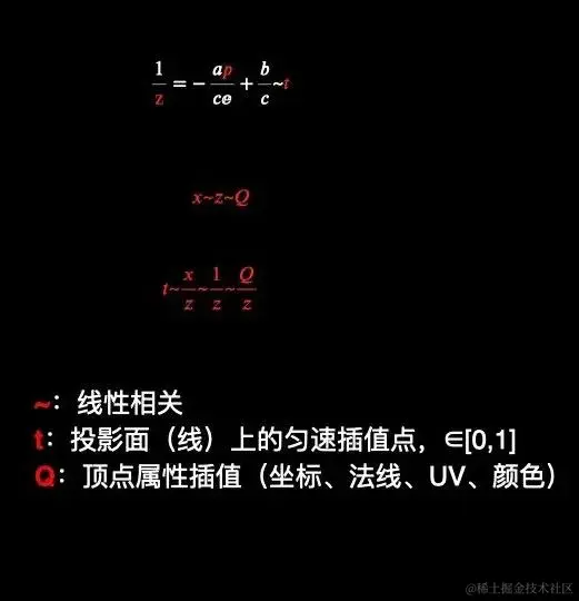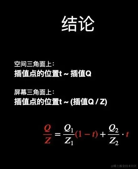 于是能够得出结论:在原始三角形上,插值与插值点的位置线性相关,但在透视投影后的屏幕三角形上,插值与Z的比值与插值点的位置线性相关。所以这就是矫正的方法:不能按照线性函数来插值,而应该按照下图中非线性的公式来插值。\