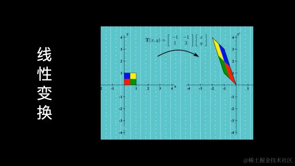最简单的插值办法就是线性插值,所以我们先来了解一下什么是线性变换。如果2个变量之间可以用y=kx+b表示,那么x和y就是线性相关,从x变换到y就是线性变换,比如下图中,每个顶点乘上一个同维度的线性矩阵后,新的形状保持了一些特性:平行线仍然是平行的,各处密度均匀,原点不变。如果原点位置变化的话那就得加上平移,线性矩阵变成仿射矩阵。