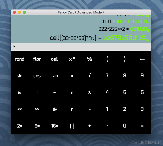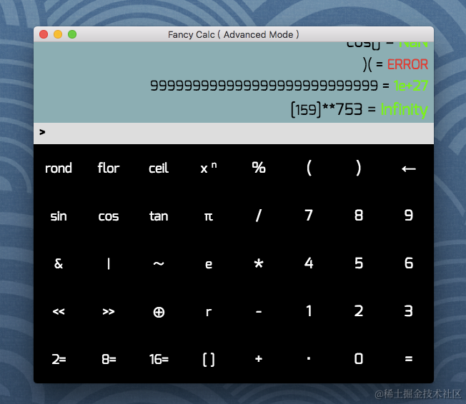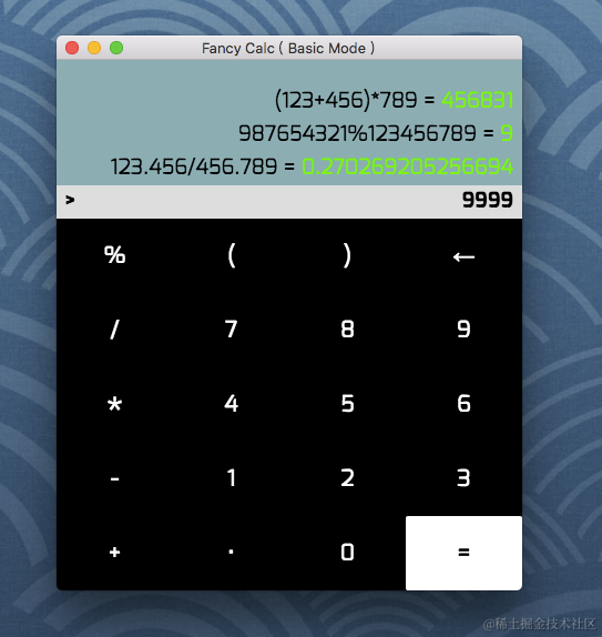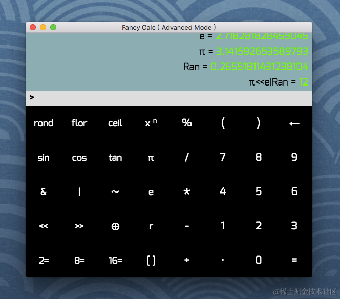 看完《node.js设计模式》头脑一热就开发了一部electron应用, 这已经是第三次做app项目了; 当时觉得吧, mac自带的计算器太鸡肋, 就自己开发了一个更高级的...; 我这里通过 Electron 实现了一个很精致的计算器.具体演示看截图; 没有用到任何的第三方库,甚至mathjs.js都没用;