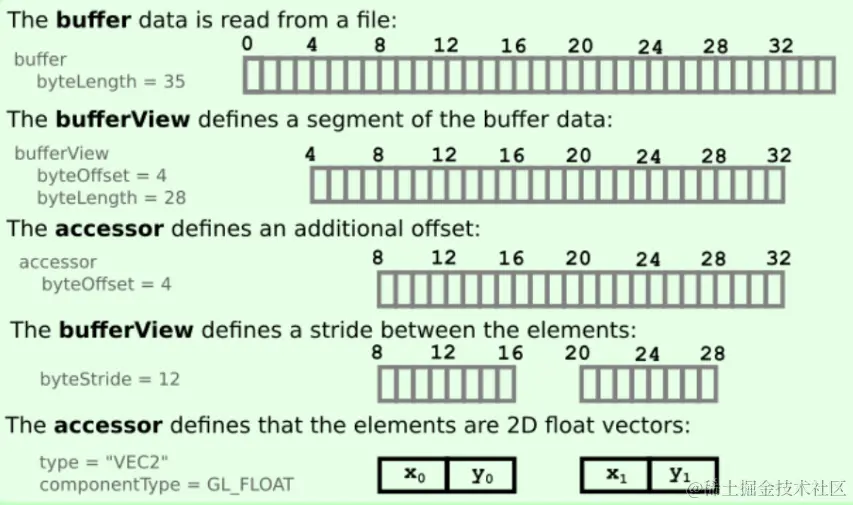 byteStride:表示每个元素实际上占用12个字节,可以通过下图有个直观的了解byteStride的作用。