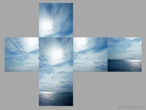 第二种方式是天空盒,即将上述的天空球变成一个正方体盒子,好处是减少了许多三角面片,只剩12个面,但通常要准备上下左右前后6张图片来贴合天空盒。比如这样: