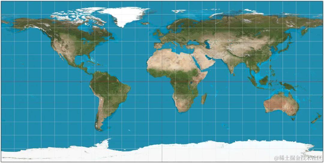 静态天空球就是360度全景摄像机的原理,它和墨卡托投影有点类似,但是正轴等距圆柱投影,想象一个经纬球,它的经纬线自然展开,UV坐标如下: