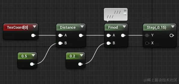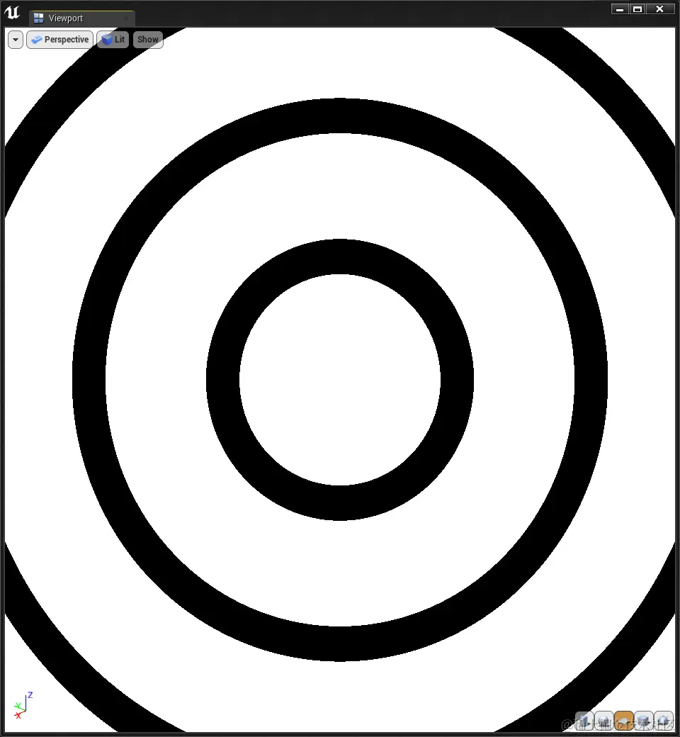 所以思考算法的时候一定要想象函数图像,才能一目了然。由于像素到圆心距离是0~0.5,我们先对0.2取余(影响圆环的数量),然后取图像上大于0.15的部分作为圆环的宽度,于是得到了如下的算法:\