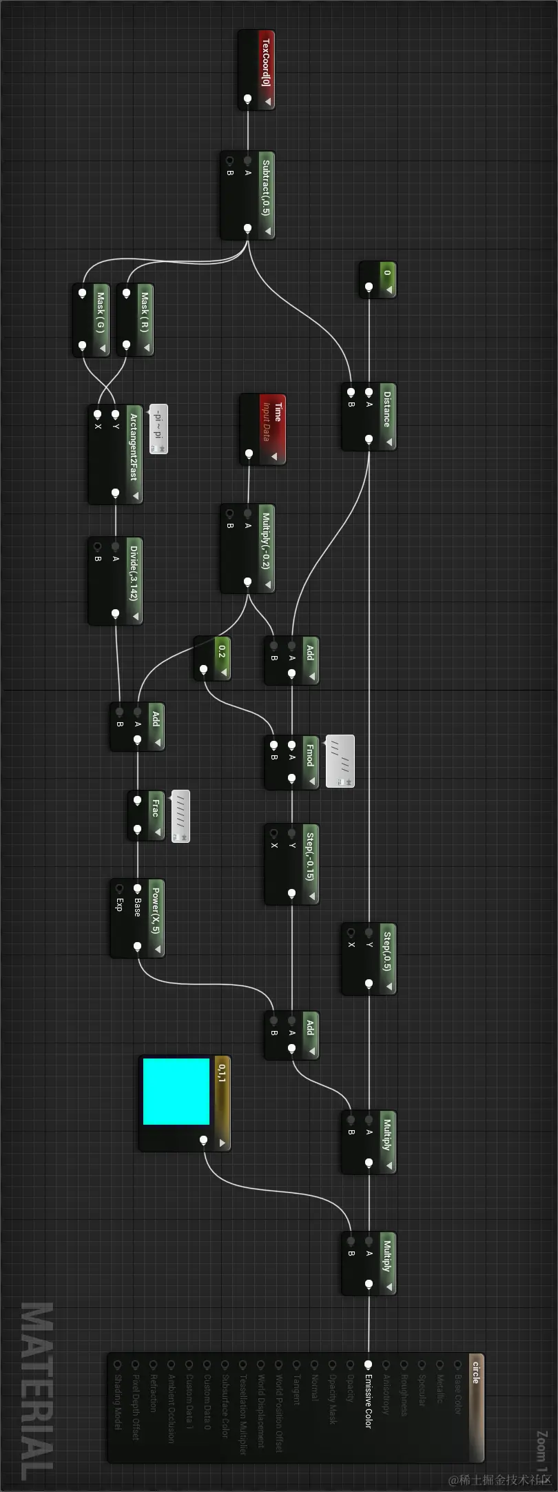 最后我们把三种buffer叠加起来,注意我没有使用蓝色节点,全是绿色的,因为绿色节点是HLSL标准库函数,蓝色节点是UE自定义的函数(往往由多个标准函数组成),这样做是为了使shader代码更容易复现。\