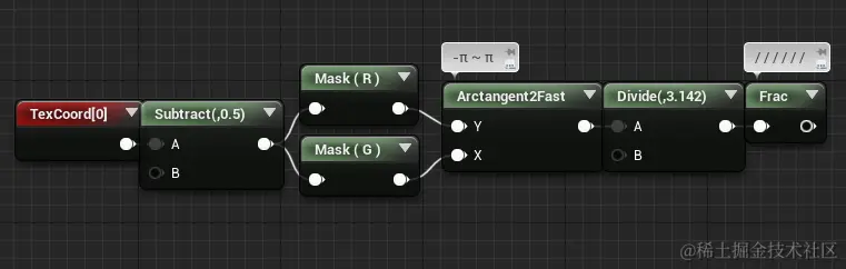 如果要让它动起来,则需要加上Time参数。最后我们做扇形渐变。从动画中可以看出,以圆心为原点的二维极坐标中,随着角度α不同,透明度不同,所以我们先求出像素的α值:利用反正切函数可以快速求出。