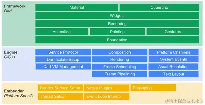 Flutter 框架采用了分层设计,此设计的目标是帮助开发者使用更少的代码完成更多工作。例如,Material 层是由 widgets 层的普通 widget 组成的,而 widgets 层本身是通过来自 rendering 层的低级对象构建的。