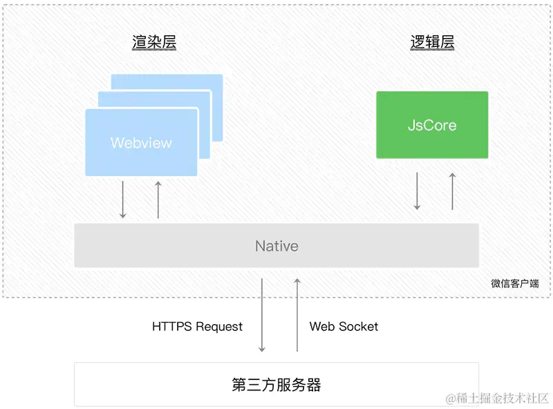小程序的运行环境分成渲染层和逻辑层,这两层分别由 2 个线程管理,渲染层的界面使用了 WebView 进行渲染,逻辑层采用 JsCore 线程运行 JS 脚本。这两个线程的通信会经由微信客户端(Native)中的 JSBridage 做中转。逻辑层发送网络请求也经由 Native 转发,小程序的通信模型下图所示。