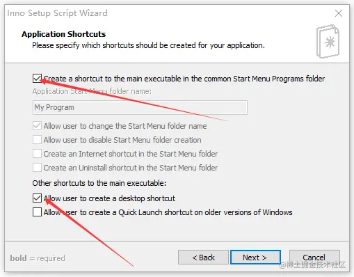 e.指定应用程序的快捷方式,勾选默认的两项即可,即“创建主执行程序的快捷方式到公共开始菜单程序文件夹”、“允许用户创建桌面快捷方式”