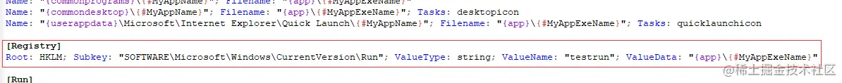 Root: HKLM; Subkey: "SOFTWARE\Microsoft\Windows\CurrentVersion\Run"; ValueType: string; ValueName: "testrun"; ValueData: "{app}{#MyAppExeName}"