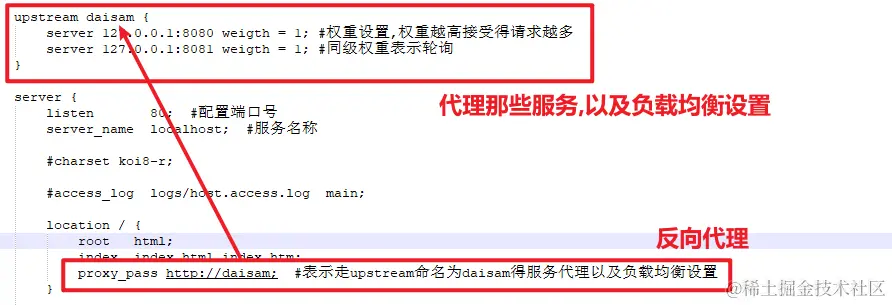 解读:当用户请求 localhost:80时请求打到Nginx,然后会通过location里面配置得命名找到对应得服务以及负载均衡配置进行请求分发,最终打到去我们得系统服务上面。