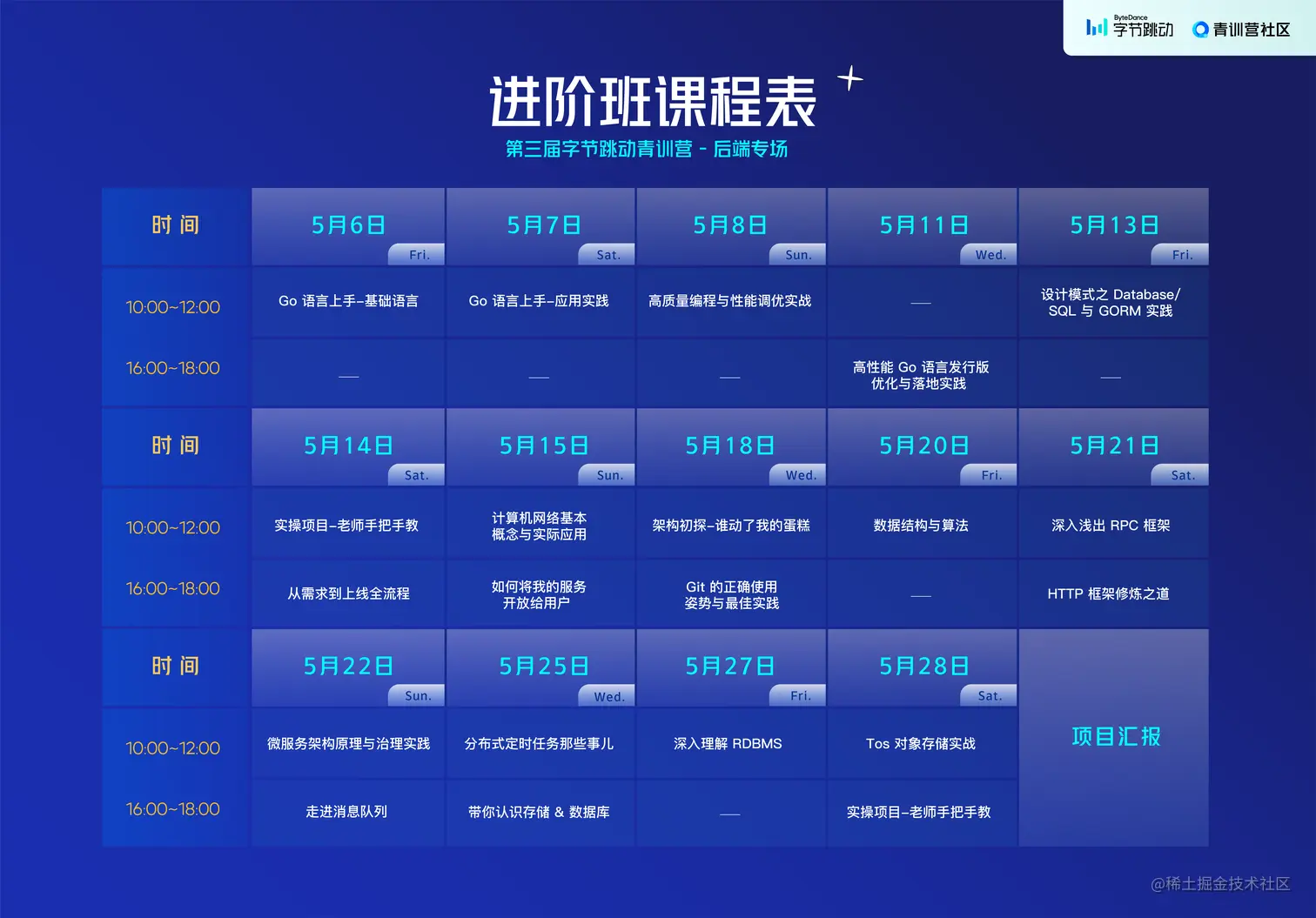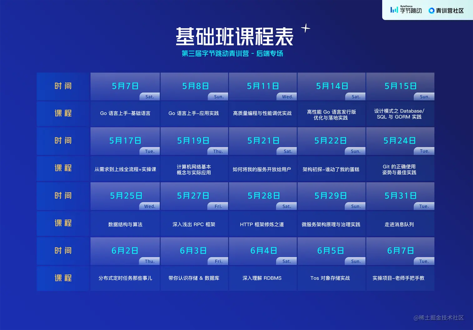 第三届字节跳动青训营 - 后端专场,邀请了20多位来自字节跳动基础架构、Data 与各业务线技术大咖与一线优秀工程师,全程免费在线向大家教授企业级后端研发必学干货,从主流编程 Go 语言原理与实现到公司级项目设计与实践经验分享,真实补齐课本学习与就业需求差异,全周期技术实操演练,提升综合专业开发能力。