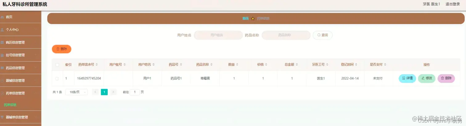 药单管理:在药单信息管理页面中可以对索引、药单流水号、用户账号、用户姓名、药品号、药品名称、数量、价格、总金额、医生工号、登记时间、是否支付等信息进行详情操作