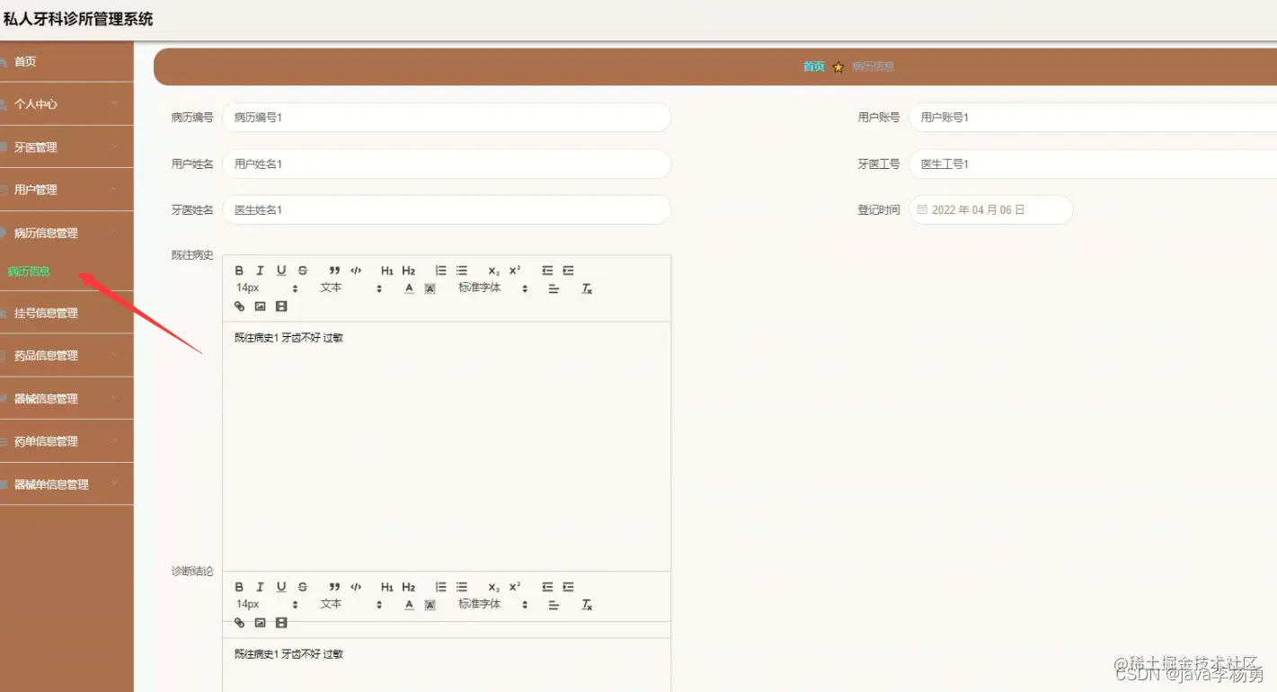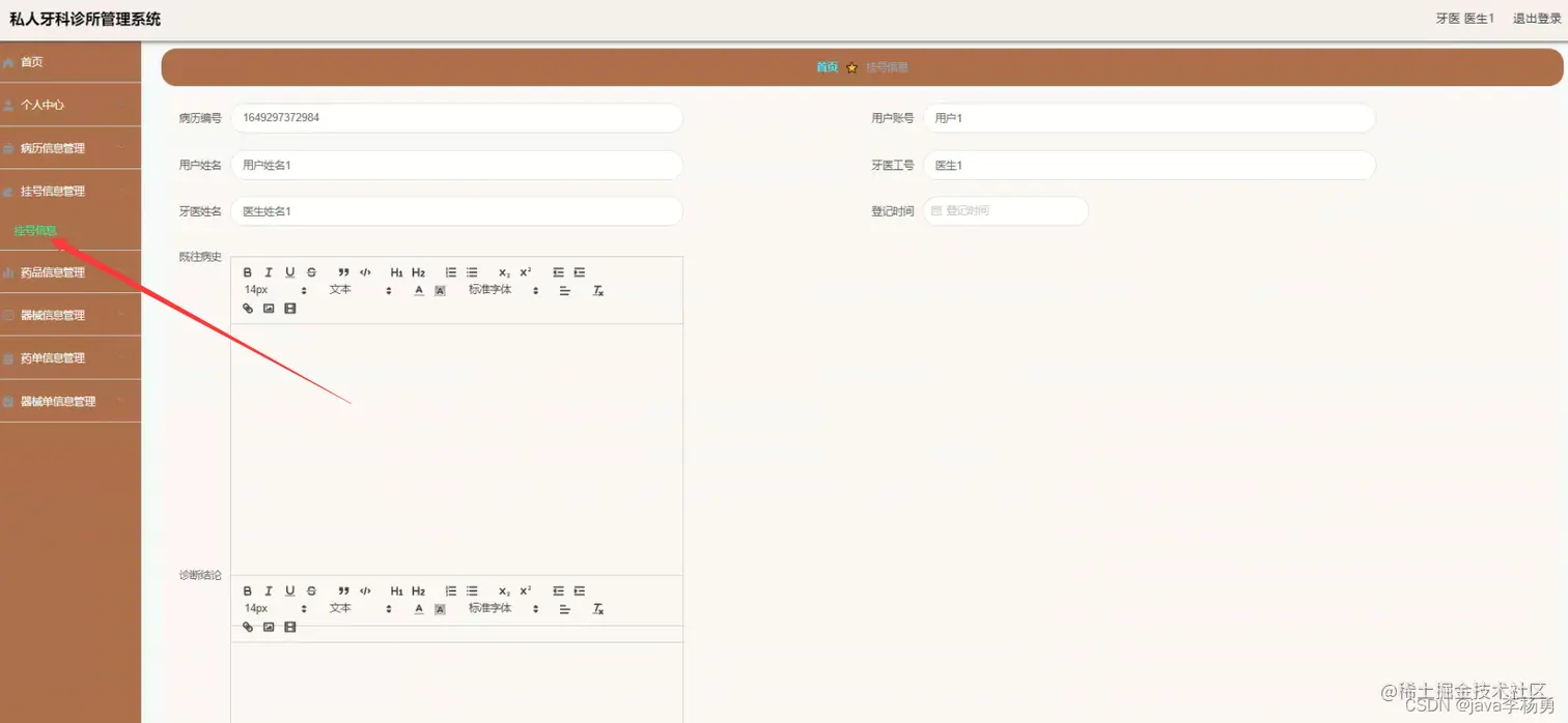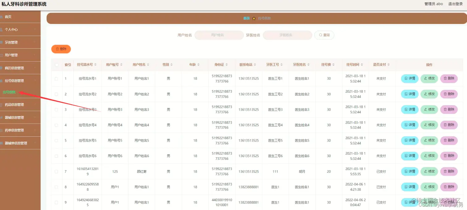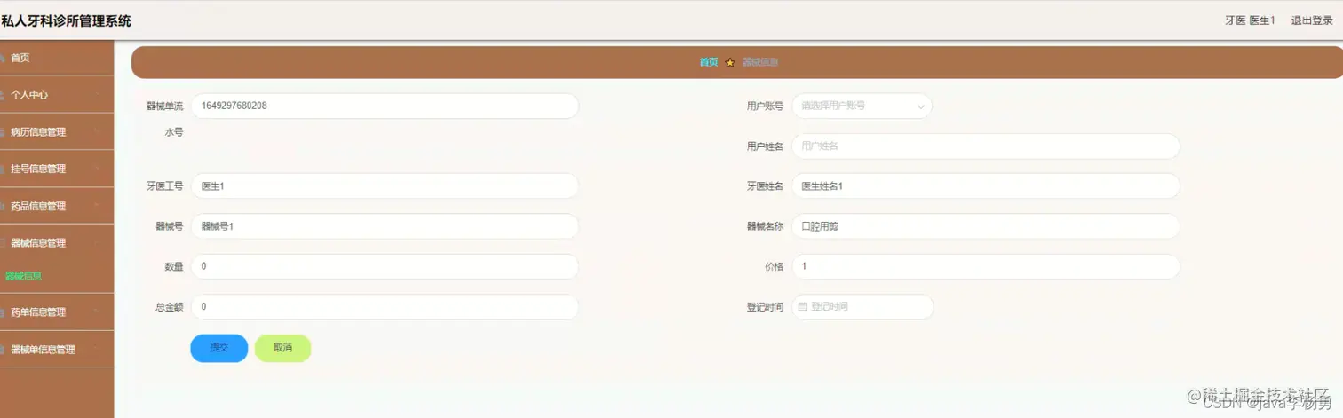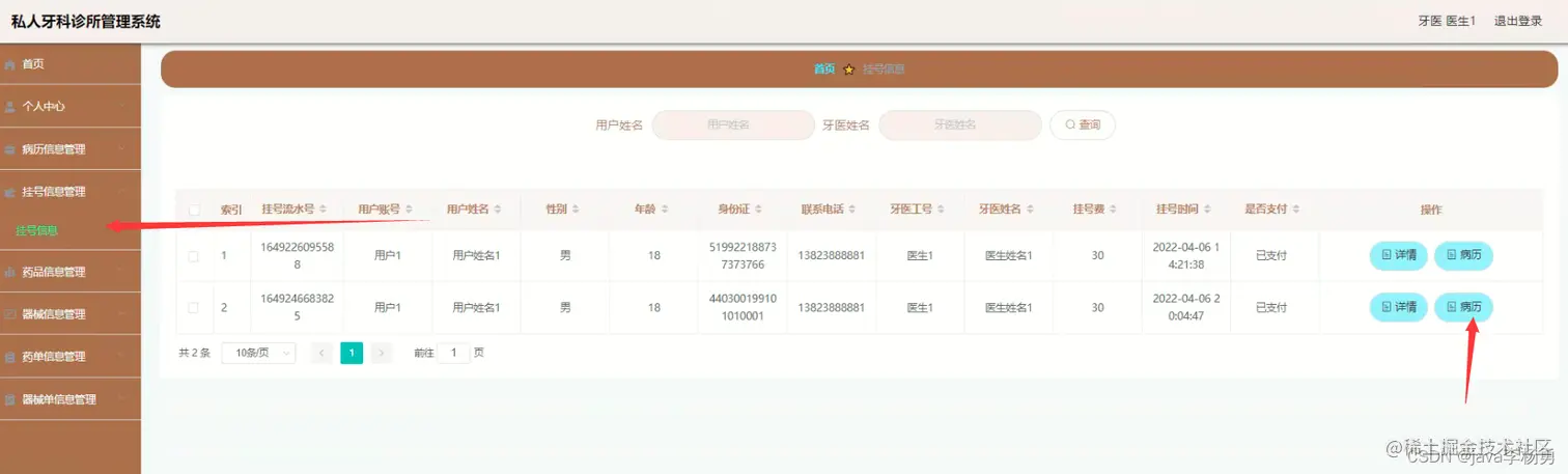 登录注册:管理员登录进入牙科诊所信息化管理平台之后,就可以对所有的信息进行查看,可以查看到首页、个人中心、医生管理、用户管理、病历信息管理、挂号信息管理、药品信息管理、器械信息管理、药单信息管理、器械单信息管理等,并且还可以对其进行相应的操作管理