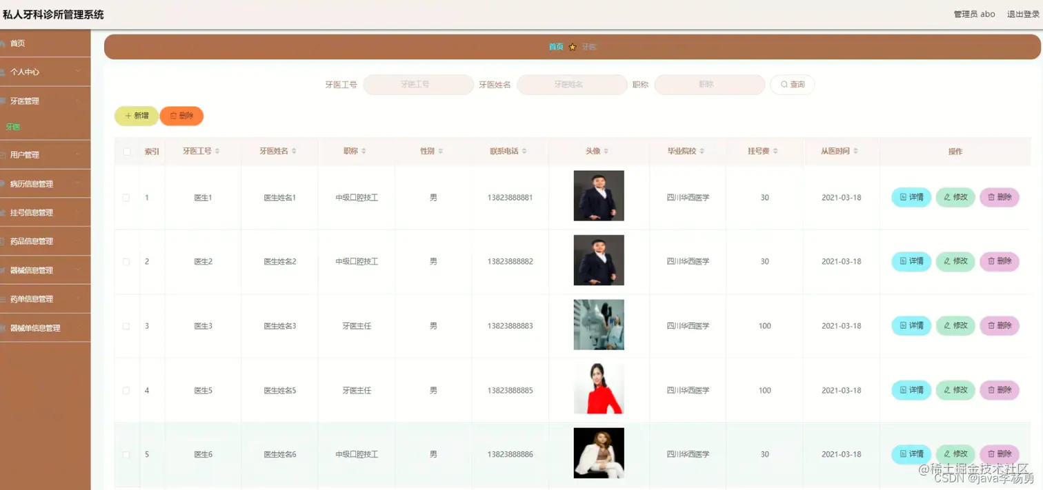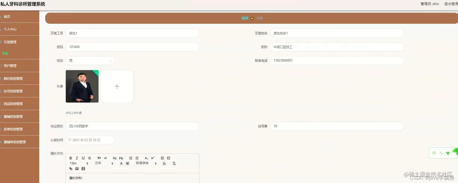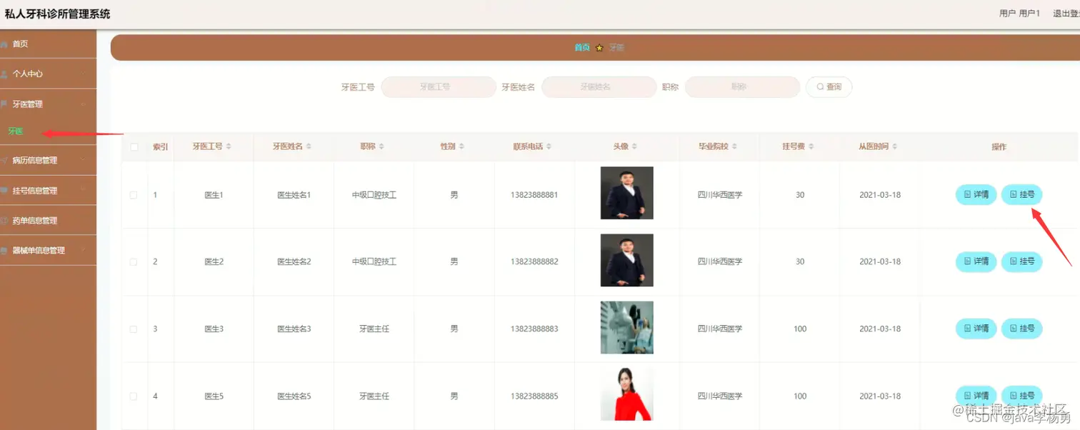 牙医管理:管理员可以查看修改删除牙医信息,牙医可以修改自己的个人信息、普通用户可以查看和挂号。