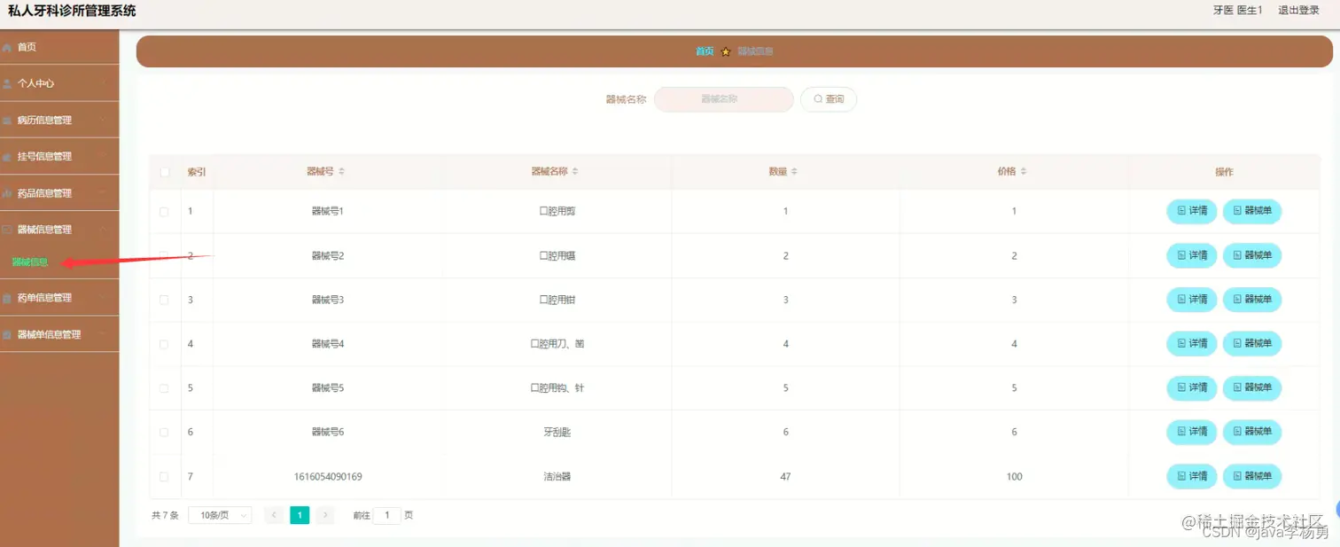 器械管理:在器械信息管理页面中可以对索引、器械号、器械名称、数量、价格等信息进行详情,修改或删除等操作