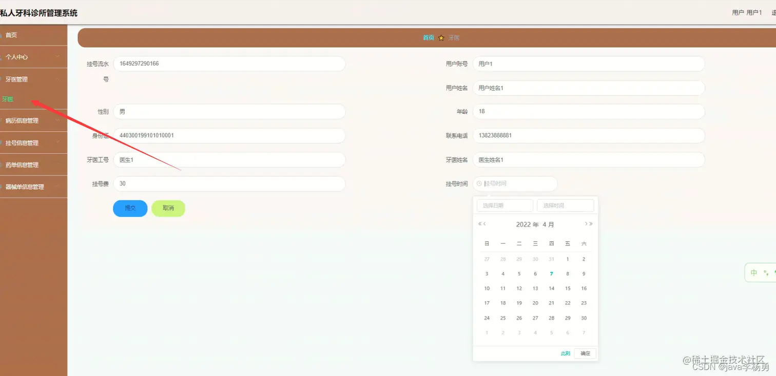 挂号管理:普通用户登录后可以选择牙医进行挂号