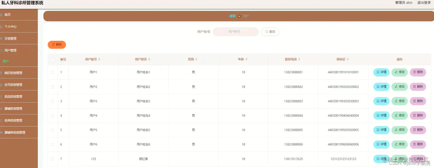 用户注册:在注册页面中通过填写用户账号、用户姓名、密码、年龄、联系电话、身份证等信息完成用户注册。用户登录进入牙科诊所信息化管理平台可以查看首页、个人中心、医生管理、病历信息管理、挂号信息管理、药单信息管理、器械单信息管理等信息进行详细操作
