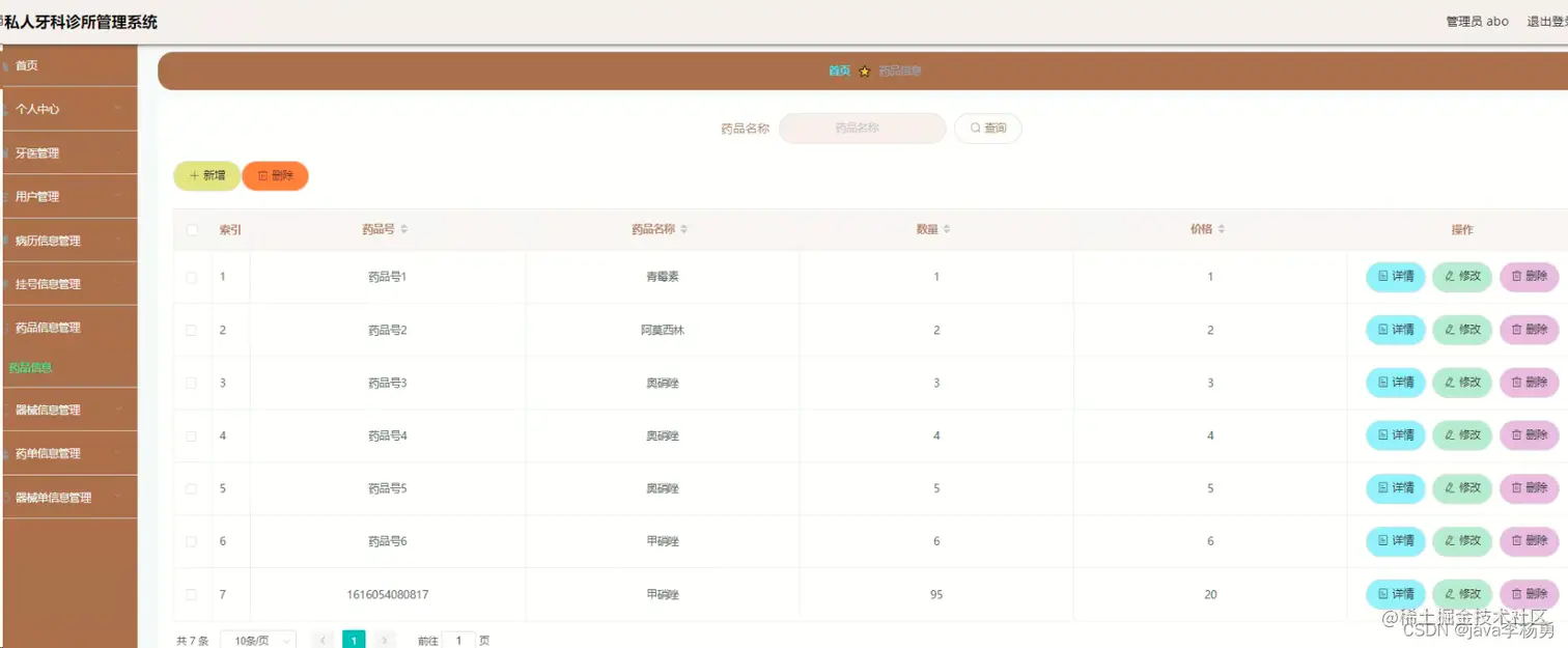 药品管理:在药品信息管理页面中可以对索引、药品号、药品名称、数量、价格等信息进行详情,修改或删除等操作