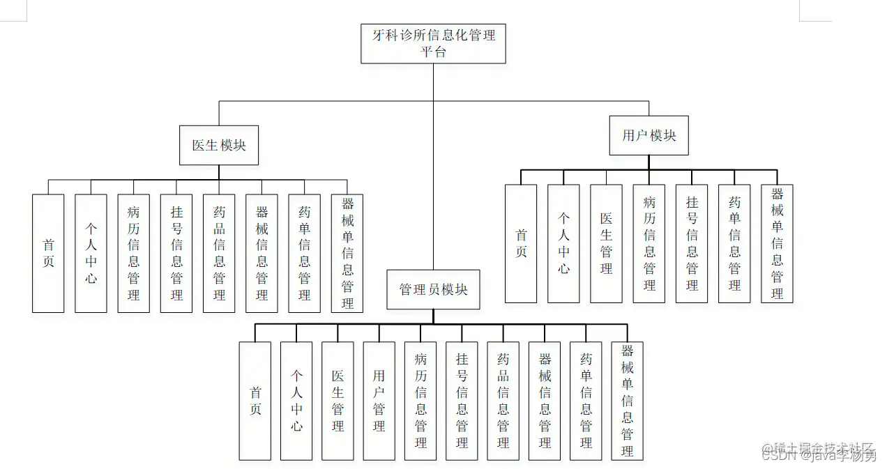 系统架构图属于系统设计阶段,系统架构图只是这个阶段一个产物,系统的总体架构决定了整个系统的模式,是系统的基础。牙科诊所信息化管理平台的整体结构设计如图所示。