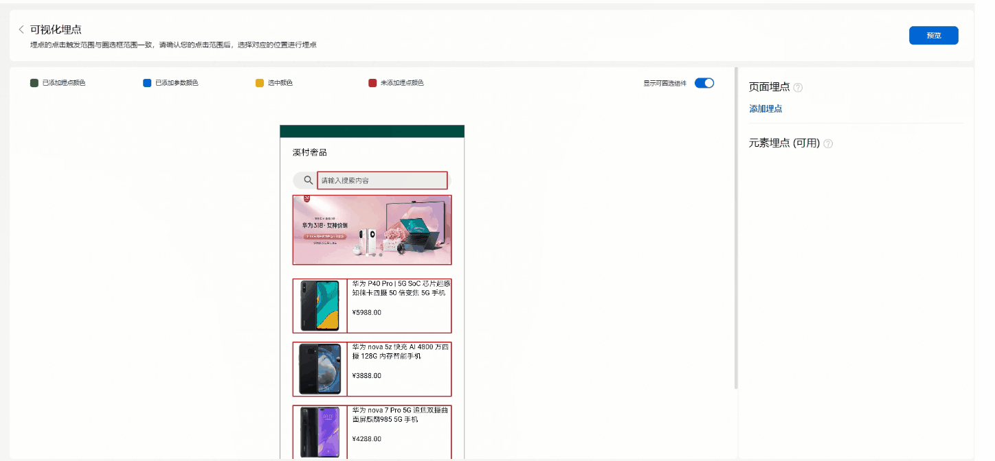 在右侧表单中添加埋点名称以及相关参数。您可以根据实际需要手动输入相关内容。您也可以通过”加号“按钮添加内容,您还可以通过”小手“按钮选择App页面中的元素作为内容。配置完成后,点击右下角确定按钮完成配置。验证配置是否正确,能否将商品列表项事件发送到HUAWEI Analytics。