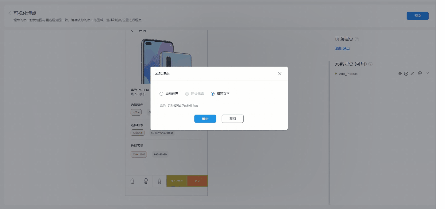 以”购买商品“事件为例(此时“购买”按钮位置易变),介绍如何使用”相同文字埋点“。进入商品详情页面,鼠标选中“购买”按钮并单击,在弹出的对话框中选择”相同文字“选项,点击”确定“按钮。