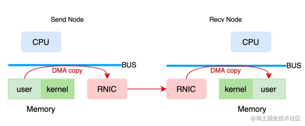 RDMA 网络中,CPU 仅负责控制面工作。数据路径上,有效负载由 RNIC 的 DMA 模块在应用缓冲区和网卡缓冲区中拷贝 (应用缓冲区提前注册,授权网卡访问的前提下),不再需要 CPU 参与数据搬运,因此可以降低网络传输中的 CPU 占用率。