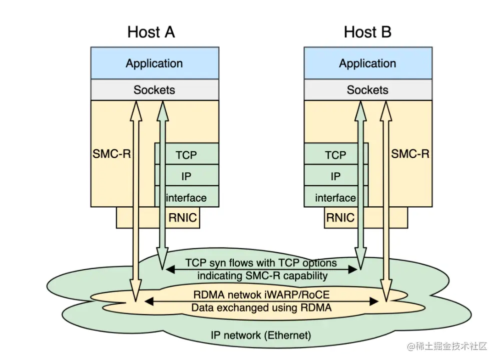 主要体现在 SMC-R 协议栈中混合了 RDMA 流与 TCP 流: