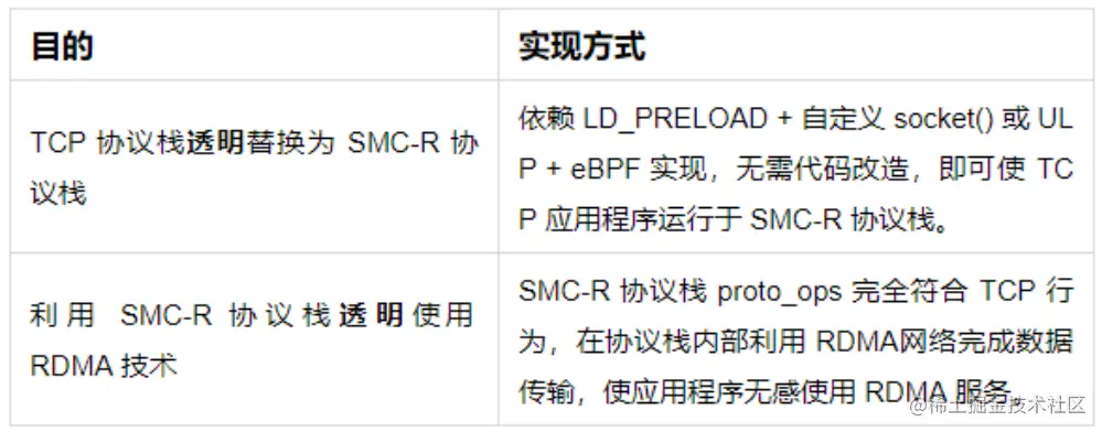 **其二,透明替换协议栈。**将应用程序创建的 TCP 类型 socket 透明替换为 SMC 类型 socket。透明替换可以通过以下两种方式实现: