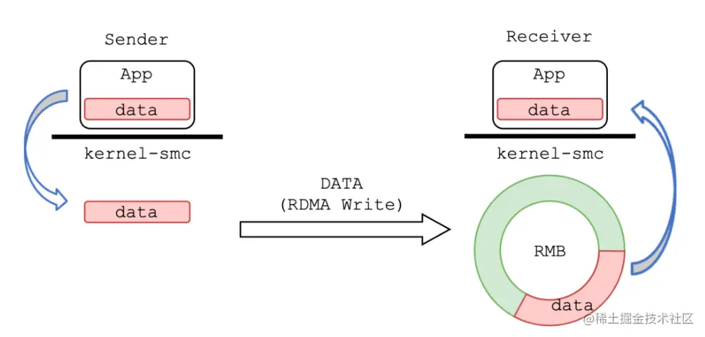 SMC-R 使用 RDMA 网络来传递用户态应用程序的数据,使应用程序透明的享受到 RDMA 带来的性能红利,即上图中黄色部分所示。发送端应用程序的数据流量通过 socket 接口从应用缓冲区来到内核内存空间;接着通过 RDMA 网络直接写入远程节点的一个内核态 ringbuf (remote memory buffer, RMB) 中;最后由远程节点 SMC-R 协议栈将数据从 RMB 拷贝到接收端应用缓冲区中。