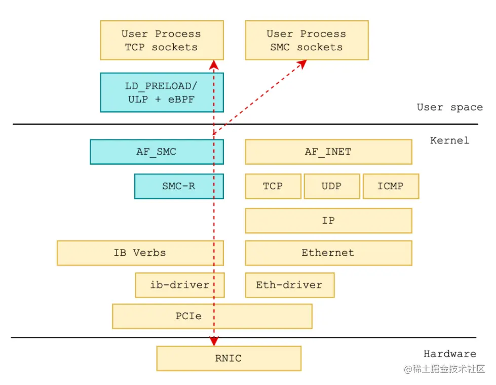SMC-R 协议栈在系统内部处于 socket 层以下,RDMA 内核 verbs 层以上。是一个具备